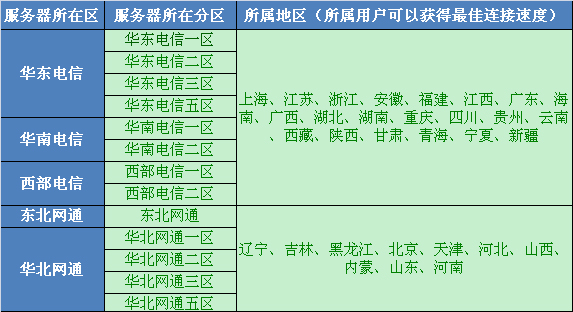 下面是每个游戏大区对应的适合地域: