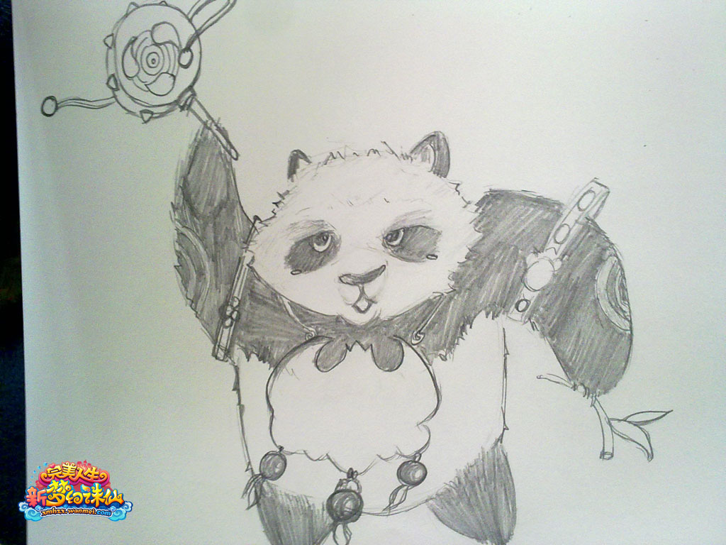 除了以《新梦幻诛仙》为素材的爆笑漫画外,玩家手绘的人物形象也格外引人注目。天音和焚香出自同一玩家之手,她们衣着华丽,生灵活现的跃于纸上;花弄影虽然只是用铅笔勾勒而出并无色彩渲染,但却透出别样清幽之感;圣巫教的熊猫憨态可掬,可是熊猫熊猫,我们的小铃铛去哪里了呢?恐怕答案只有作者才知晓吧。